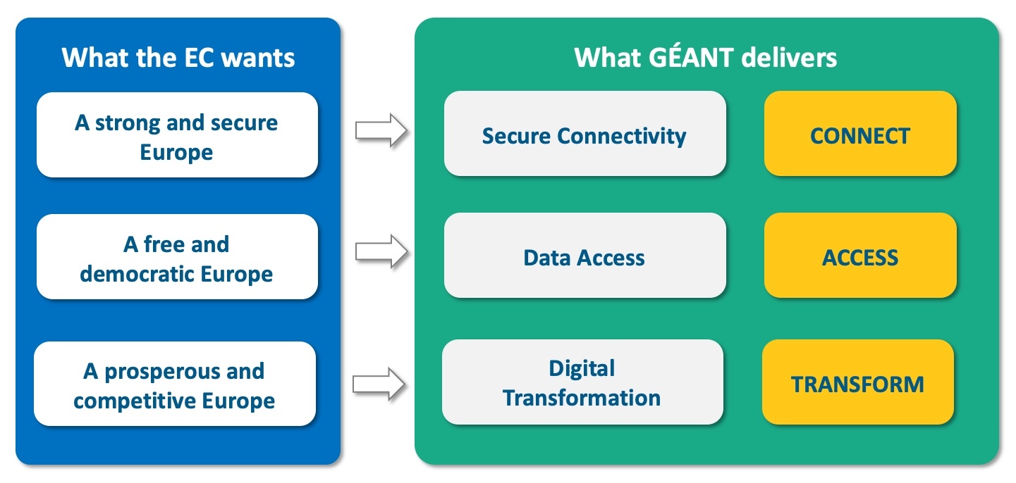 As policies and initiatives wax and wane, the one constant that we should be proudest of is the services GÉANT and the NRENs provide to our members and users. They are used by our community because they work well and are essential or useful for R&E. Hence, rather than letting large digital initiatives dictate our focus, it made sense to see how our core and growing / innovative service areas and projects could be portrayed in a more simple, all-catching way. One way is to look at how the GÉANT project services can be portrayed in a simplification of our work into the three themes of Secure Connectivity, Data Access and Digital Transformation. These three themes seem to provide a home for what we provide from Work Packages 1 – 9, albeit often with overlap or indeed all three areas being covered. One could also place here the services we provide to the Big Five within these blocks – imagine EOSC being related to Data Access, or QKD being a topic of the Digital Transformation. Our cable sensing endeavours could be there too. Most helpfully, this structure allows project participants, NRENs, national policymakers and the EC, to explain what we do in a simple, condensed way. And it matches the new political guidelines of the Commission.